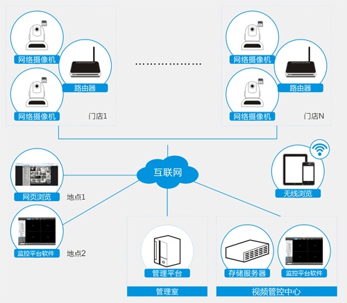 平台转发部分是指各个店面的视频图像主动发送到网络视频转发平台,通过平台在转发给各个用户。运营服务平台为整套系统的核心部分,在全国各地都部署有服务器,可以提供最佳的网络接入,无需用户自行建设服务器和投入维护人员,工程实施的成本也大大降低,却拥有很高的系统稳定性。